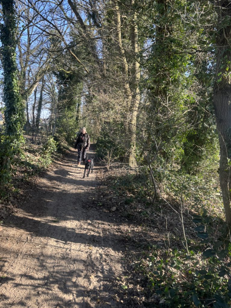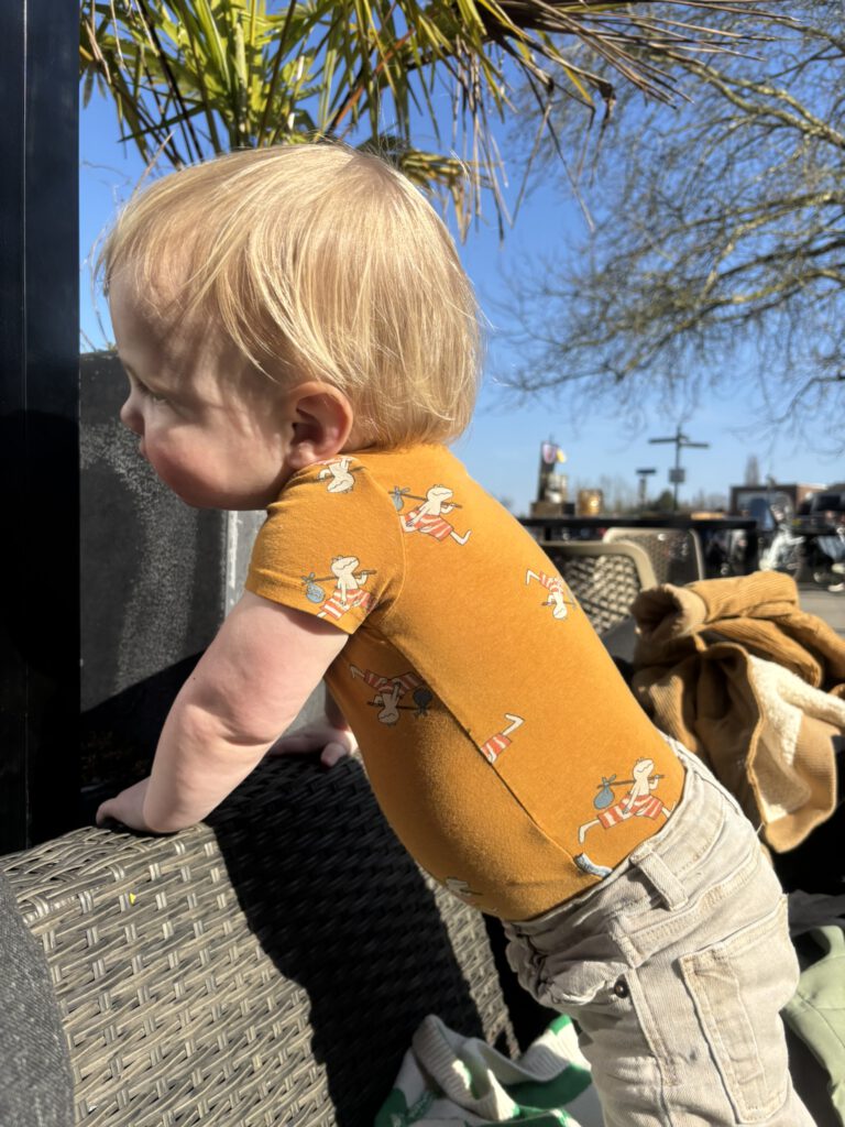 De 15 kilometer voelen precies goed — uitdagend genoeg om de spieren weer te laten werken, maar niet te zwaar voor de eerste tocht na de winter. Aan het einde van de wandeling ploffen we neer op een zonnig terras voor een heerlijke lunch. Floris eet gezellig mee, Nina krijgt een bak water, en wij genieten van een welverdiende maaltijd in de lentezon. We hebben onze auto handig aan het eindpunt geparkeerd en oma’s auto bij de start. Ideaal — zo kunnen we na de lunch zonder gedoe weer richting huis.