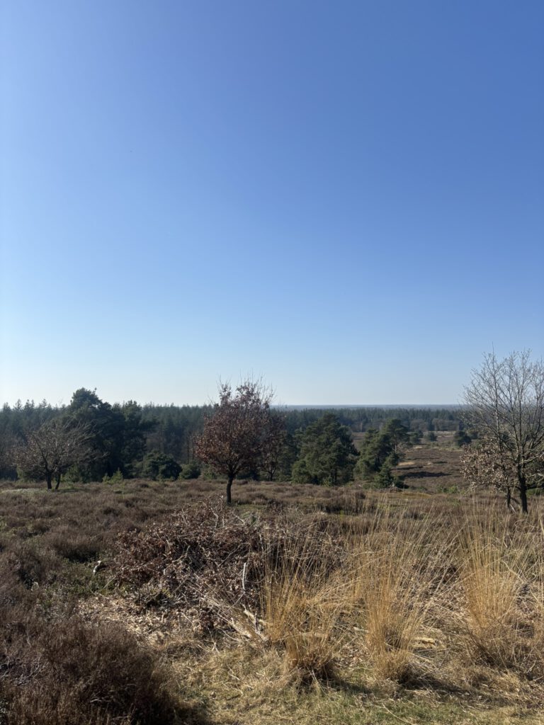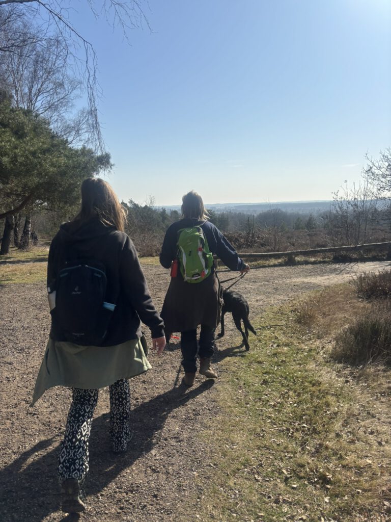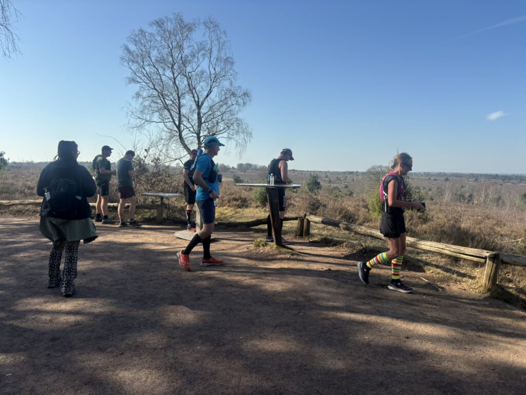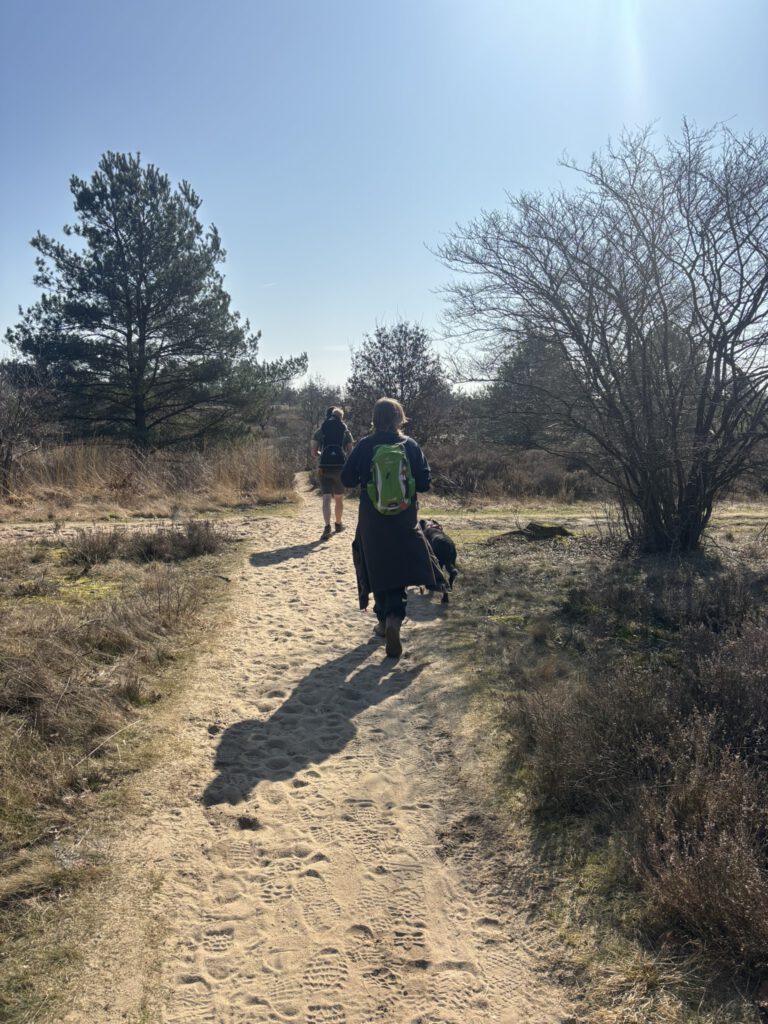 De omgeving is schitterend. De route slingert door de bossen en over de glooiende paden van de Sallandse Heuvelrug. Het pad is afwisselend: stukken heide, zandwegen en bospaden wisselen elkaar af. Soms klimmen we omhoog en hebben we een weids uitzicht over het landschap — andere keren lopen we tussen de bomen. Onderweg komen we opvallend veel mensen tegen die aan het hardlopen zijn. Er blijkt een trailrun te zijn in de omgeving, en het is leuk om al die sportieve lopers tegen te komen. Iedereen groet elkaar vriendelijk; het voelt alsof we allemaal op onze eigen manier van deze mooie dag genieten.