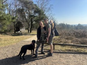 De omgeving is schitterend. De route slingert door de bossen en over de glooiende paden van de Sallandse Heuvelrug. Het pad is afwisselend: stukken heide, zandwegen en bospaden wisselen elkaar af. Soms klimmen we omhoog en hebben we een weids uitzicht over het landschap — andere keren lopen we tussen de bomen. Onderweg komen we opvallend veel mensen tegen die aan het hardlopen zijn. Er blijkt een trailrun te zijn in de omgeving, en het is leuk om al die sportieve lopers tegen te komen. Iedereen groet elkaar vriendelijk; het voelt alsof we allemaal op onze eigen manier van deze mooie dag genieten.